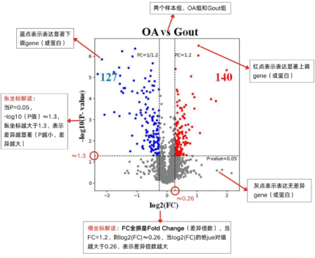 根据(FC>1.2和FC≤1/1.2,p<0.05)结果显示,与Gout相比,OA中有140个蛋白上调,127个蛋白下调。